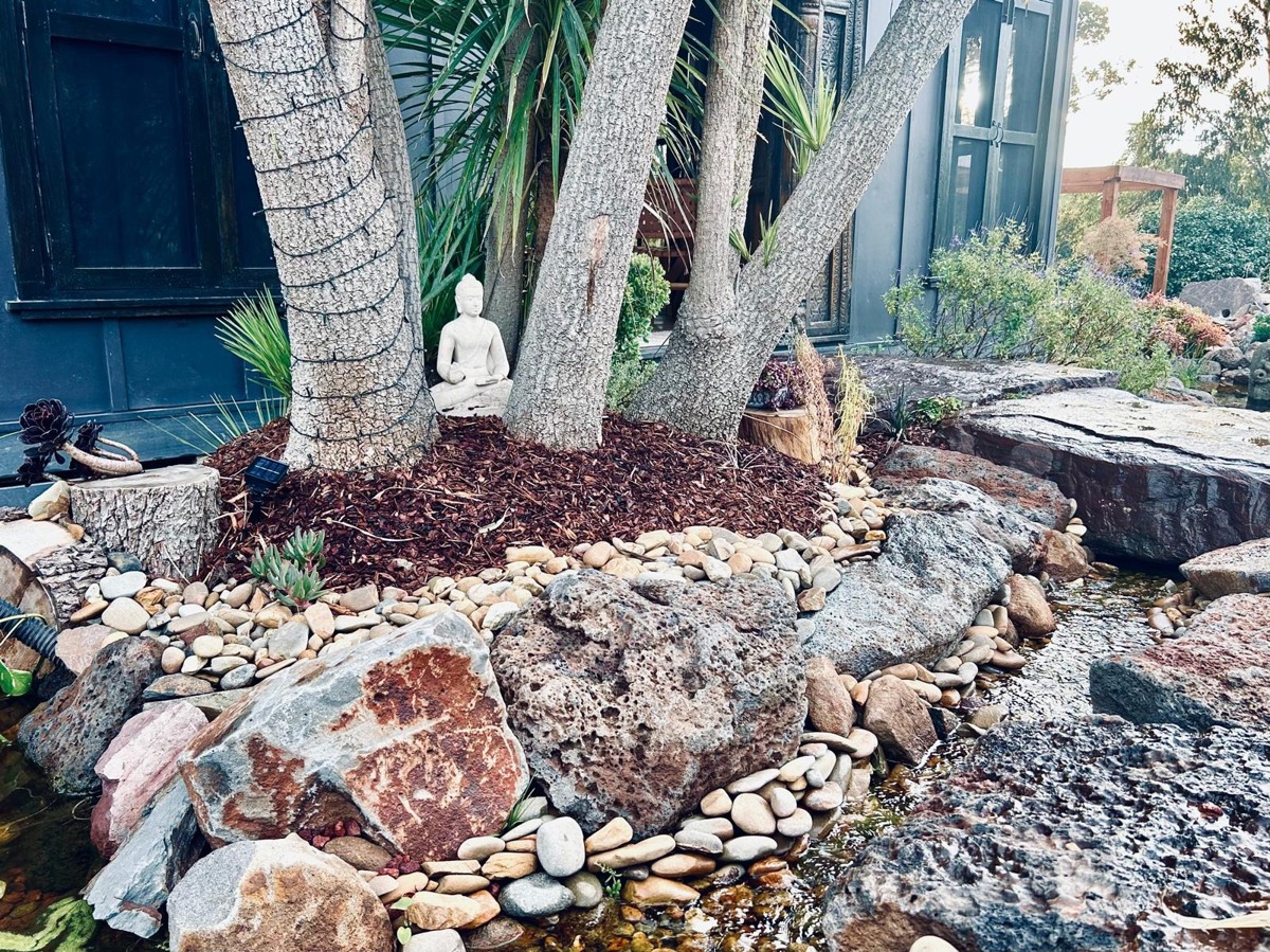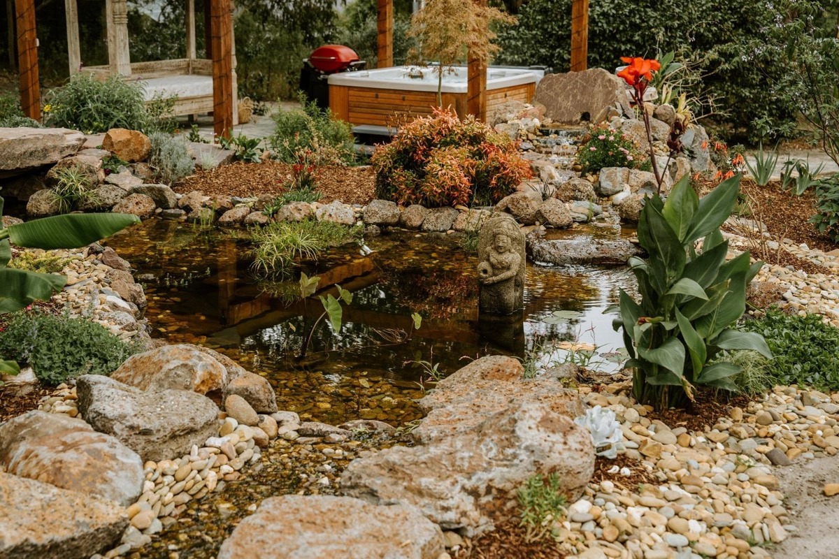 - Serene pond with fish and a gently flowing stream surrounding the house